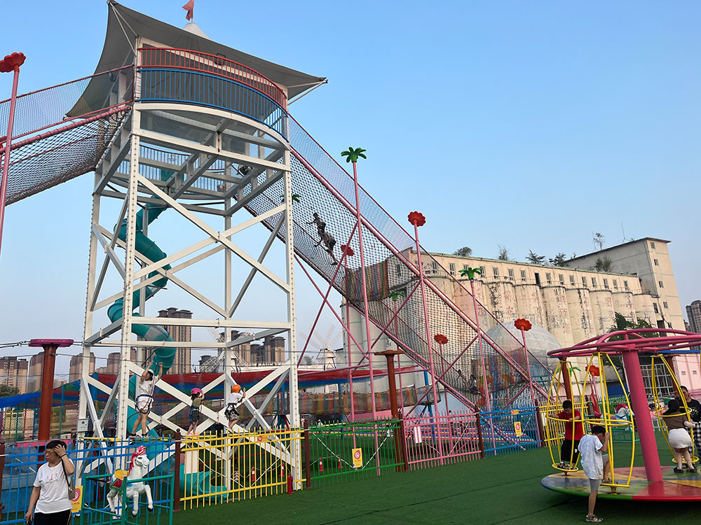 勇攀高峰是乐园的标志性设备,由攀爬网和和滑滑梯组成,中间安装玻璃站台,可以根据预算选择高度和宽度,还可以和玻璃栈道结合做成乐园的地标性游乐项目。是大型亲子游乐园的必备项目。