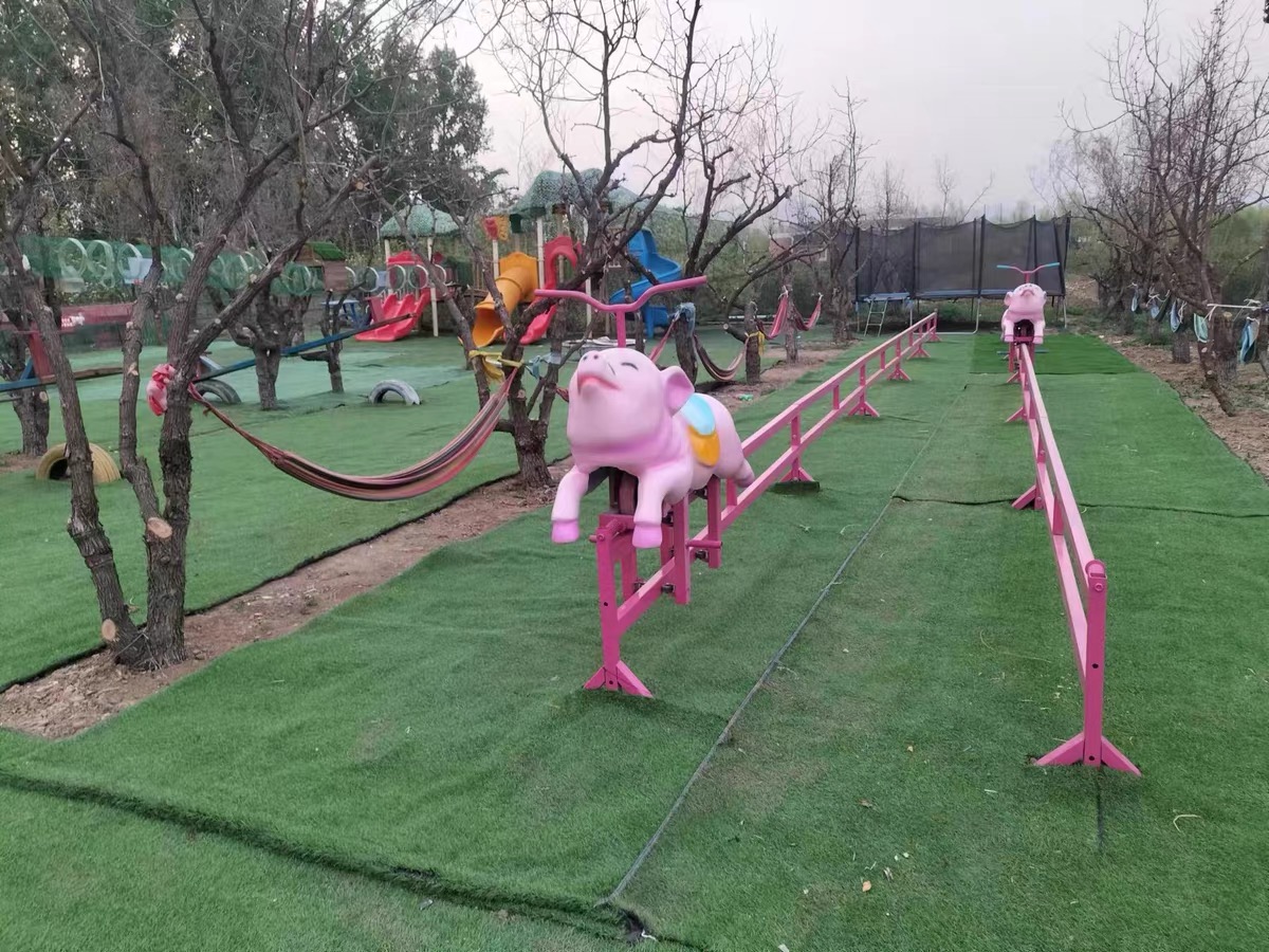 小猪赛跑,轨道长15米,一般两条以上组成一组。游客通过手动前后摇动手把推动小猪前进,趣味性、互动性非常强。是农庄、景区等场地引流必备产品。